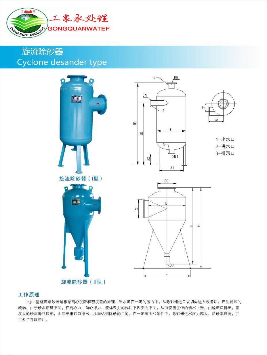 GQ系列旋流除砂器的特點: 1、結構簡單,操作簡便,使用安全可靠,幾乎不需維護。 2、與擴大管、緩沖箱等除砂設備相比,具有體積小,處理能力大,節省現場空間等優點。 3、可在不間斷供水過程中清除水中的砂粒。 4、避免了其他除砂方式存在水質二次污染的現象,除砂效率高。